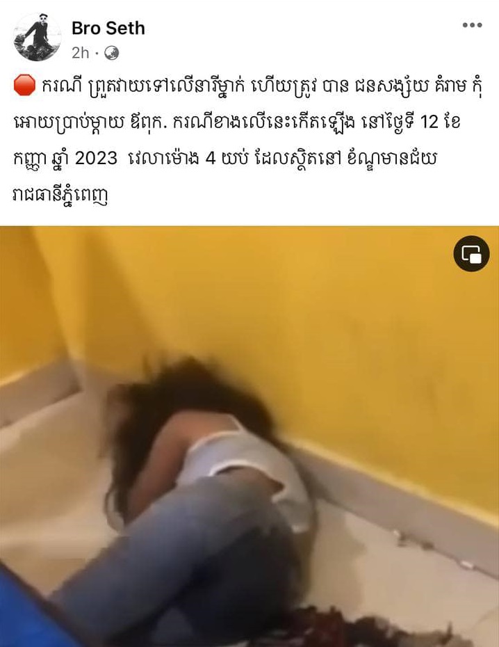 ហេតុការណ៍ហិង្សានេះបានកើតឡើង កាលពីវេលាថ្ងៃទី១២ ខែកញ្ញា ឆ្នាំ២០២៣ វេលាម៉ោងប្រហែល៥ព្រឹក ស្ថិតនៅផ្ទះសំណាក់យីហោ៣៤២ ស្ថិតលើផ្លូវ២៧១ សង្កាត់ស្ទឹងមានជ័យ២ ខណ្ឌមានជ័យ រាជធានីភ្នំពេញ ទើបតែបែកធ្លាយវីដេអូនៅពេលថ្មីៗនេះ។